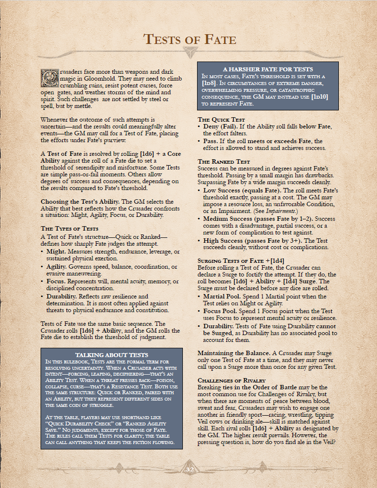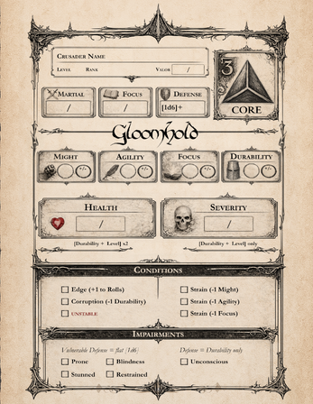 Gloomhold is a survival-based dark fantasy tabletop roleplaying game designed to be driven primarily by narrative. Built on the 3Core system and its Imagination First philosophy, the dice mechanics are deliberately streamlined—prioritizing attacks met with active defense rather than static armor ratings, and placing narrated consequences above complex rules and mechanical overhead.